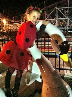 We took the girls to Dutch Wonderland for an early trick-or-treating. They recycled last year's ladybug costumes. It was a great night. The weather was perfect and lines for rides were minimal. After the girls collected their candy, Savannah put on her brave face and rode the big roller coaster with Daddy. She liked it so much that she went back for a second ride. The little girls were content to play in this little tiny playground. Where else would one find a TRAIN and a DUCK (I know it isn't a duck but Lila requested that I call it one so that both girls had their "favorites!") Pictures were taken with my phone. . .